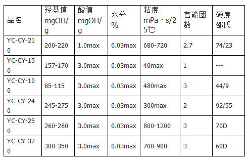 YC-CY 是我公司研發(fā)的聚氨酯原料的總稱, 分為多元醇, 雙組份聚氨酯等品種。 這些原料都是以天然油脂蓖麻油為原料。它充分利用了蓖麻油的低粘度、 低發(fā)泡性、 顏料分散性、 耐水性、 絕緣性能、 耐沖擊性等特點, DYC-CY 可廣泛用于生產(chǎn)防腐涂料。 粘著劑、 地坪涂料、 彈性體等多種用途DYC-CY 是一種專用于聚氨酯的蓖麻油多元醇, 它根據(jù)搭配羥基的不同活性, 同時兼具熱穩(wěn)定性、 耐水性、 耐酸性及耐溶劑等特點, 以便于生產(chǎn)出硬度不同的功能性聚氨酯材料。